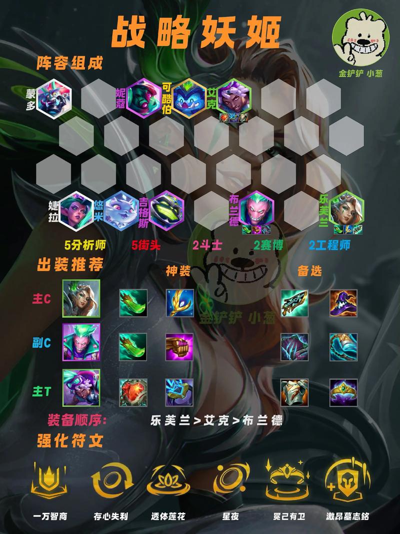 〖One〗、阵容构成:六黑魔、三矮子、两白魔。主C为狐狸,副C为蚂蚱。装备选取 狐狸必备装备:蓝BUFF(光明最佳)、科技枪、法爆(备选巨杀、法师帽、大天使)。蚂蚱备选装备:蓝BUFF、鬼书,第三件根据情况选取法师类装备。