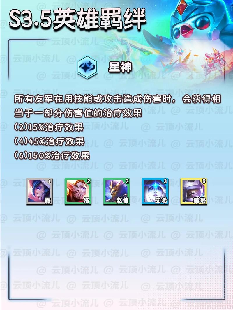 〖Three〗、星神羁绊在云顶之弈中是一个非常实用的羁绊,能够为队伍提供持续的治疗,增强队伍的续航能力和生存能力。玩家可以通过合成星神法球来增加队伍中的星神数量,从而提升治疗效果。在战斗中,合理利用星神羁绊的治疗效果,往往能够帮助队伍取得优势。
