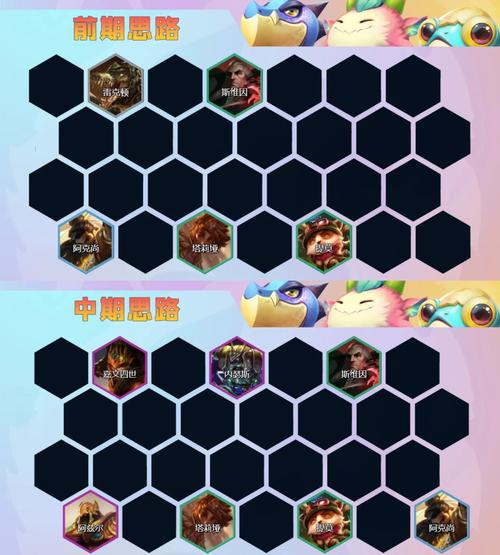 -1阶段:升四人口,优先用护卫+怒翼龙或护卫+迅捷射手过渡,前期输出装备可以给伊泽瑞尔或赛娜。2-5阶段:升五人口,优先补二黯灵龙+二炮手,但前期不需要献祭任何英雄。3-2阶段:升六人口,小搜一波找到泽丽或努努,补强袭炮手或重骑兵即可。