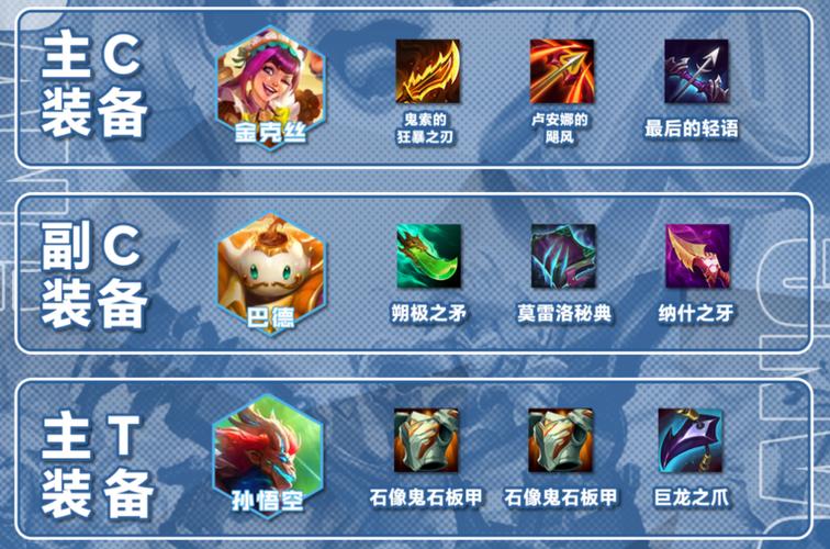 诺姆希:优先合成鬼索的狂暴之刃(羊刀)、巨人捕手(巨杀)、最后的轻语(轻语),提升攻速与破甲能力。格雷福斯:装备饮血剑、无尽之刃、泰坦的坚决,增强爆发与生存。赫卡里姆:携带狂徒铠甲、荆棘之甲(反甲)、龙爪,提升坦度。功能装备:基克的先驱(给前排或辅助单位)可提升炮手攻速。