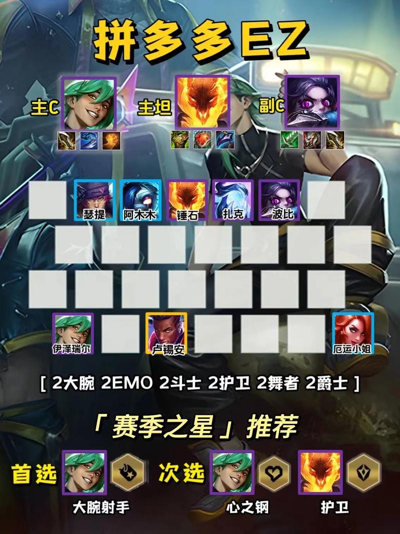 〖Four〗、金铲铲之战S15拼多多阵容主要包括以老鼠(图奇)作为主C的阵容和“水晶宗师”阵容。以老鼠(图奇)作为主C的拼多多阵容 阵容组成:老鼠(主C)+ 艾克(副C)+ 蔚(前排)+ 卡蜜尔(控制)+ 发条(辅助)+ 任意3秘术/2保镖。