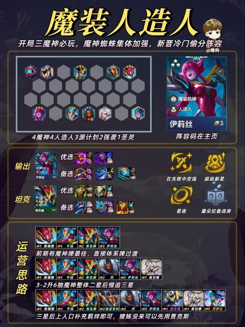 〖Two〗、金铲铲S9符文大陆推荐阵容如下:高爆发输出型阵容皮城祖安枪:以四枪手为核心,泽丽作为主C,中期通过霸龙+金克斯拿装备过渡,节奏紧凑,4-1阶段升至七级后D牌强化阵容。六法拉克丝:依赖法转开启六法师羁绊,7级即可成型,法师中低费卡多,过渡平滑。