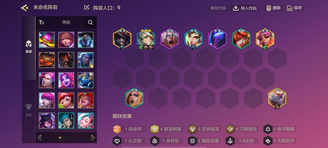 阵容核心与站位阵容由布隆、洛、韦鲁斯、巴德、黛安娜、奇亚娜、图奇、伊泽瑞尔、霞组成,羁绊为4迅捷射手、1吟游诗人、2屠龙勇士、2冒险家、2风暴龙、2怒翼龙、2刺客、2护卫、2秘术师。