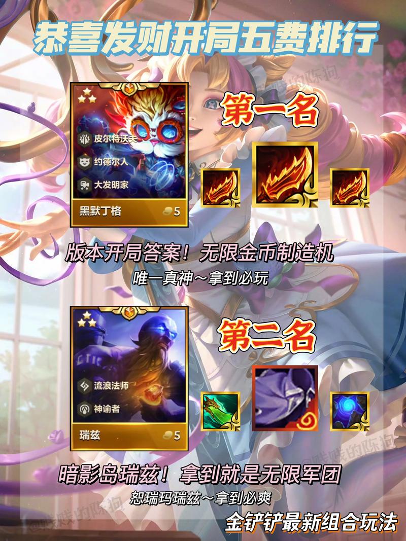 〖Three〗、特点:回血能力极强,上分神器。核心英雄:奶妈(主C),加里奥(主坦)。羁绊效果:以巨神峰和神谕者为主。装备推荐:奶妈装备法爆、大天使、科技枪;加里奥装备板甲、龙牙、反甲。裁决天使阵容 特点:超级强悍,大成吃鸡。核心英雄:天使(主C),波比(主坦)。