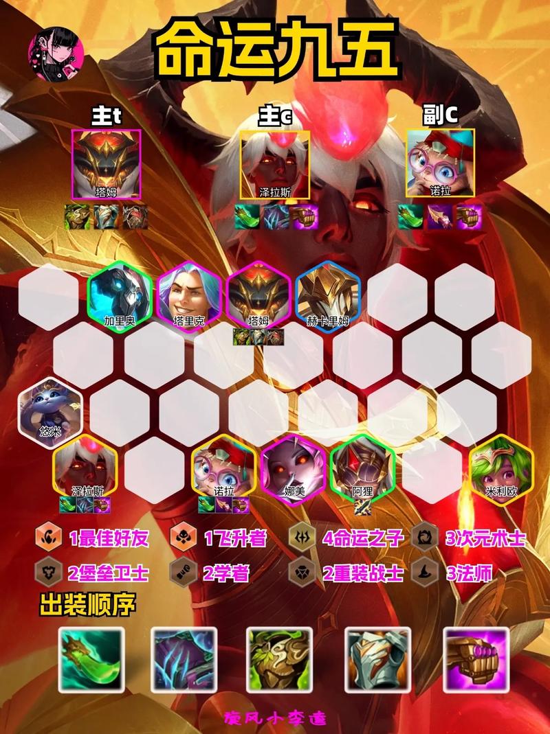 〖One〗、阵容核心 阵容构成:以3机甲(盖伦、猴子、武器/蕾欧娜)、3至高天(烬、薇古丝、派克)、3混沌(烬、牛头、蕾欧娜/佛耶戈)为核心,辅以其他羁绊如护卫、黑客等。核心思路:前期稳定血量,中期转型,后期依赖4-5费卡提升战力。