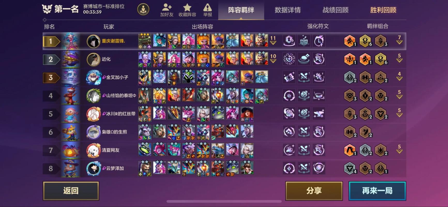 〖Three〗、阵容组成:逆血战姬(龙女)、北境之傲(狮子狗)、虚空恐惧(大虫子)、未来守护者(杰斯)、狻猊之心(纳尔)、南天之怒(狼人)、皮城执法官(蔚)、悟空(猴子)。该阵容构成了4狂野4斗士3换形师2海克斯科技的羁绊组合。