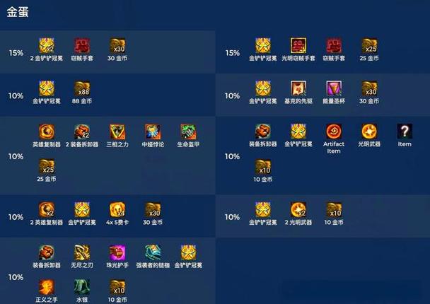 还可以在金蛋中获得2个窃贼手套、1个金铲铲冠冕、1个妮蔻之助、若干金币,或3个五费英雄、2个四费英雄。金铲铲金蛋的特点 金蛋就相当于以前版本中的龙族,一样需要几个回合来孵化蛋,不过在这个版本中的海克斯给的蛋明显物品要好一点。