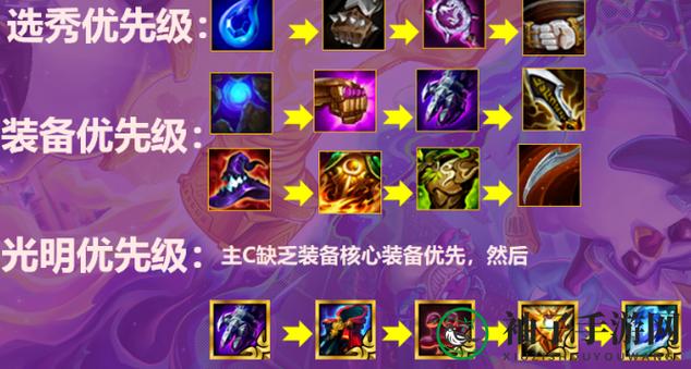 核心成员:古拉加斯、索拉卡、辛德拉、艾翁、卡尔玛、提莫、沃利贝尔、盖伦,构成4黎明使者+4神谕者+2亡魂战士+2复苏者+2斗士的羁绊体系。主C卡尔玛装备:完美三件套:蓝BUFF(必备,缩短技能释放间隔)、法爆(提升暴击伤害)、无尽(确保暴击率,几乎必秒多数主C)。