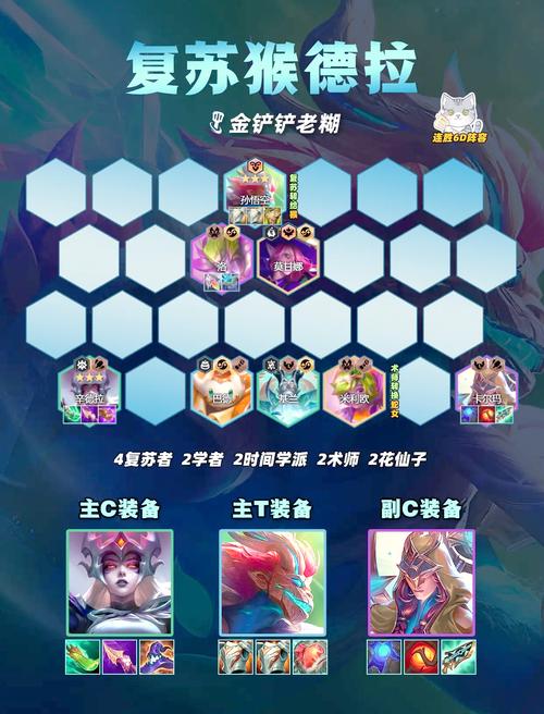 〖One〗、阵容组成与核心羁绊核心英雄为猴子(悟空),搭配辛德拉、洛、莫甘娜、巴德、时光、老头、丁真、卡尔玛。关键羁绊包括:4复苏:提升团队持续作战能力,通过复苏转职可激活5复苏,增强续航与技能频率。2花仙、2时间、2术师、2学者:提供法术强度、控制与辅助效果,强化阵容综合战力。