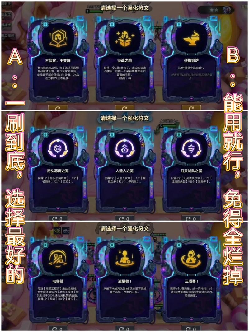 〖One〗、强度还行,运营阵容经济一般可以直接拿。银汤匙:适合前期质量高时拿。辅助挖矿:比较好的银色强化之一。不拘一格:第二个来连胜时血量靠前可以拿。不推荐:后援最差:数值很低,尽量不拿。幸存者:上限很高但是很难达成,尽量不选。以上推荐仅供借鉴,具体选取还需根据游戏实际情况和玩家自身策略来决定。