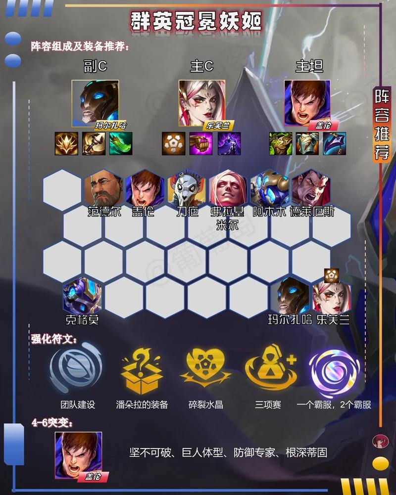 〖One〗、阵容组成:天罚弩神、不屈战神、华剑战姬、驱邪圣枪、曙光神将、齐天大圣、圣光战神、驱影双生、双枪女帝。羁绊组成:7神将2枪手2骑士2游侠。装备推荐:天罚弩神带羊刀、飓风等;不屈战神/华剑战姬带救赎、反甲、狂徒等;双枪女帝带青龙刀、鬼书、剑转等。阵容特点:依赖7神将的高额生命值和攻击力加成,适合赌狗玩法。