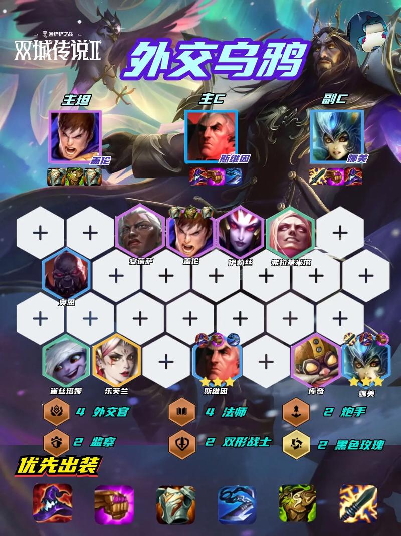 〖One〗、乌鸦装备:必备装备为鬼索的狂暴之刃(提供攻速加成)和大天使之杖(提升法术强度)。最后一件装备可根据情况选取水银(免疫控制)、科技枪(吸血)、电刀(减魔抗)或巨杀(对大型单位造成额外伤害)。妮蔻装备:作为前排坦克,建议给予肉装,如狂徒、反甲、龙牙等,以提升其生存能力。