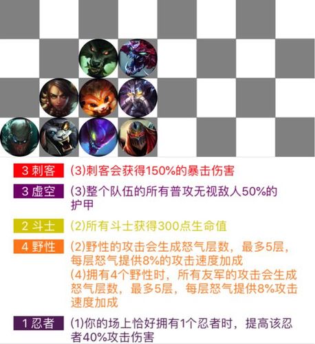 〖Three〗、阵容组成与羁绊 阵容组成:科加斯、玛尔扎哈、卡萨丁、雷克顿、卡莎、维克兹、亚索、卑尔维斯。阵容羁绊:8虚空2格斗2挑战2法师1女皇。此阵容以虚空羁绊为核心,提供高额的真实伤害。装备搭配 主C卡莎:必备装备:鬼索的狂暴之刃,提供持续的攻速加成,非常适合卡莎的技能机制。