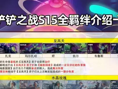 金铲铲之战S15的羁绊包括至高天、水晶玫瑰、刀锋领主、斗魂战士、小怪兽训练师、星之守护者、超级战队、战斗学院等。至高天:该羁绊下,生命值最低的至高天弈子会获得治疗,数额相当于由至高天弈子和暗影国度弈子造成的一定百分比的伤害值。暗影国度会打击几个相距最近的敌人,造成魔法伤害。