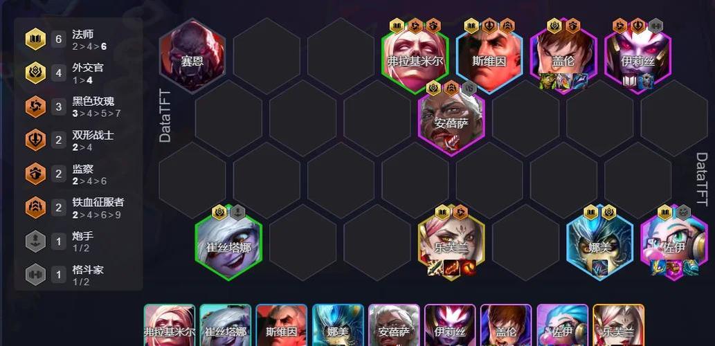 主C黛安娜:海克斯科技枪刃+无尽之刃+泰坦的坚决。主坦赛芬:刺客纹章+饮血剑+无尽之刃。副C派克:冰霜之心。玩法思路 前期:2阶段用塔姆、伊泽瑞尔、奇亚娜、凯隐等英雄过度,尽量保持连胜,选秀拿物理输出散件。中期:3阶段拉6人口小搜一波,尽量搜到二星黛安娜,存钱准备上7人口。