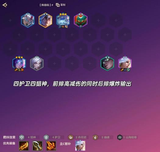 狂徒铠甲:增加生命值,提升坦度。巨龙之爪:提供魔法抗性,应对AP伤害。替代装备:日炎非必需,石像鬼和冰心是不错的肉装选取。阵容搭配 阵容组成:曙光、布隆、风女、小炮、女枪、发条、烬、女警。羁绊组成:4狙神、2保镖、2白魔法师、2精密发条。