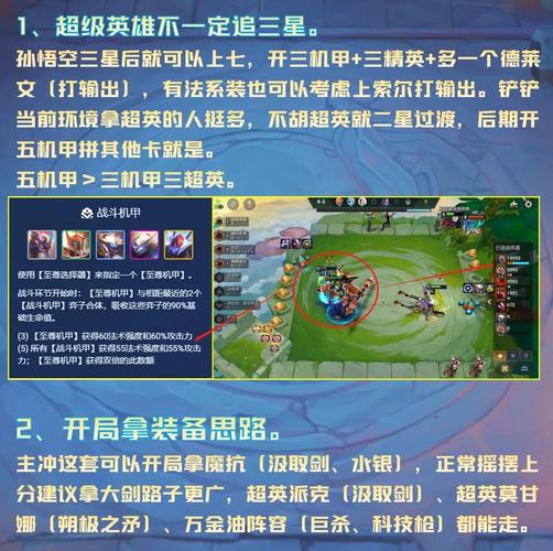 〖Two〗、在金铲铲之战S8赛季中,机甲猴子的玩法推荐如下:核心羁绊:4斗士:提供高生命值,增加阵容坦度。3战斗机甲:确保猴子的坦度,同时提升输出能力。3超级英雄:增加伤害,提升整体战斗力。2护卫:为队伍提供护盾,增强防御。1王牌精英:增强队伍的控制能力。