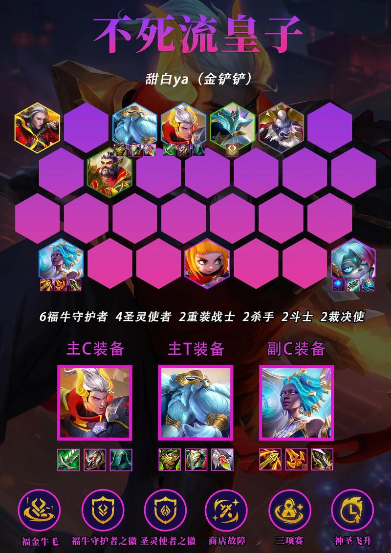 阵容组成:天罚弩神、不屈战神、华剑战姬、驱邪圣枪、曙光神将、齐天大圣、圣光战神、驱影双生、双枪女帝。羁绊:7神将2枪手2骑士2游侠。核心装备:天罚弩神带羊刀、飓风及飓风/肃静/降星之刃/神圣之刃,不屈战神/华剑战姬带救赎/反甲、狂徒及日炎,双枪女帝作为副C带青龙刀/鬼书、剑转及水印。
